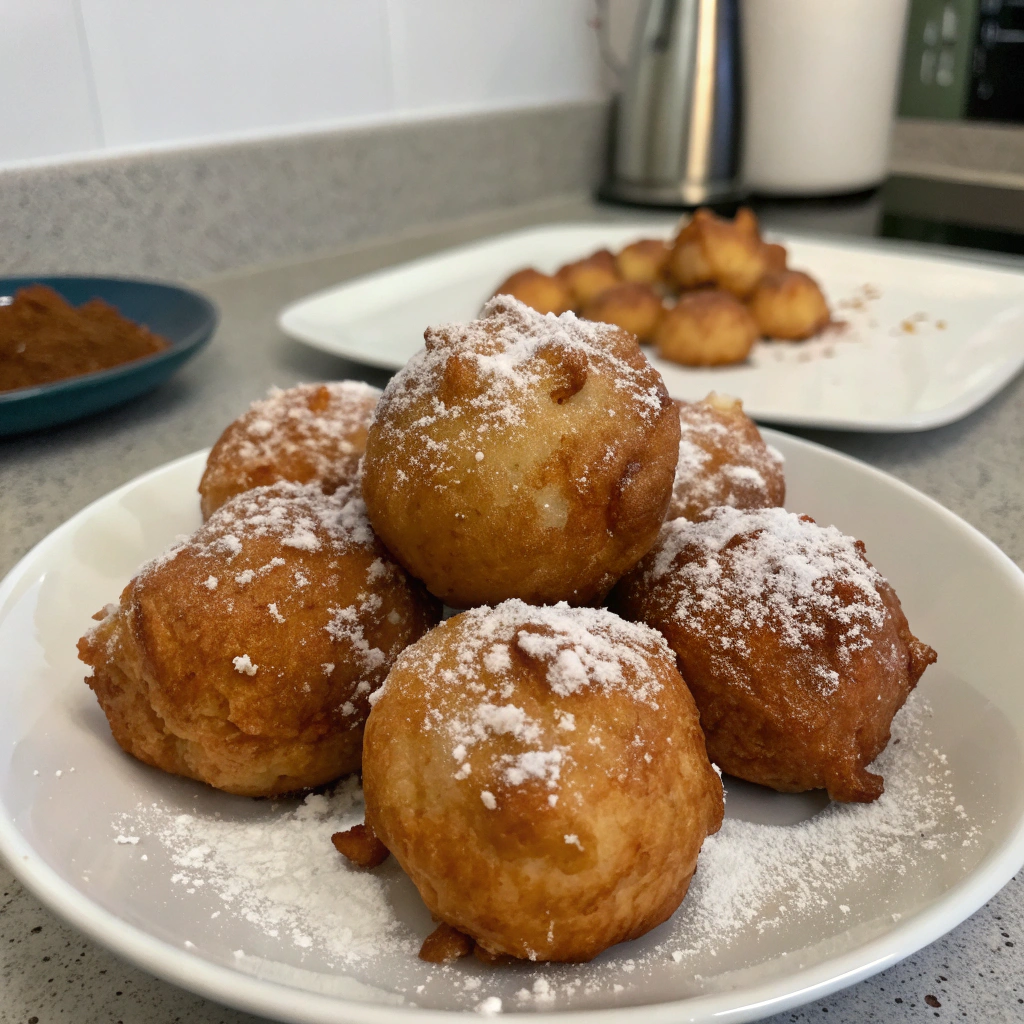 - Let the glaze set slightly, then serve the fritters warm or at room temperature.