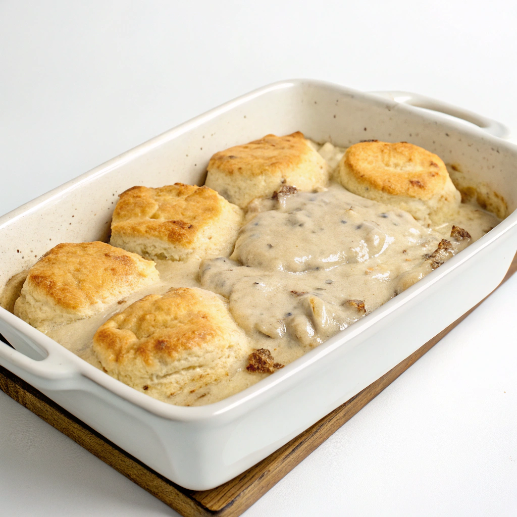 If you want to prep ahead, cook the sausage gravy layer and mix the egg mixture the night before, then assemble with the biscuits in the morning right before baking so they stay fluffy.