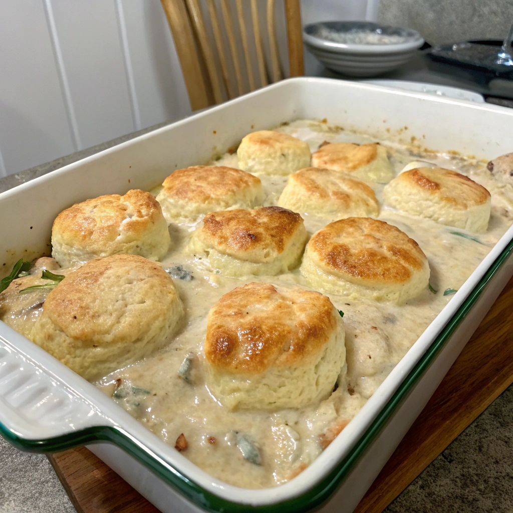 This Creamed Chicken and Biscuits Casserole is cozy, creamy, and wonderfully hearty—exactly the kind of comfort food that brings everyone to the table. Tender chicken is mixed with a rich, savory sauce, topped with fluffy biscuits, and finished with melted cheddar for the perfect golden crust. It’s an easy weeknight dinner or a satisfying weekend bake, and it pairs beautifully with a simple green salad.