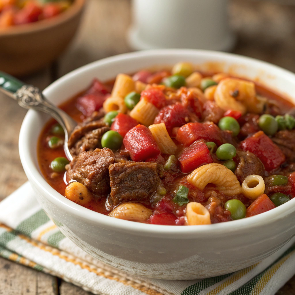 This crockpot goulash is a cozy, family-friendly one-pot meal loaded with tender beef, veggies, pasta, and a rich tomato broth. It’s the perfect dump-and-go recipe for busy days—you get all the comfort of classic goulash with minimal prep and hands-off slow cooking. The macaroni soaks up all the savory flavors, while peas add a pop of sweetness and color. Serve it warm for a hearty dinner everyone will love.
