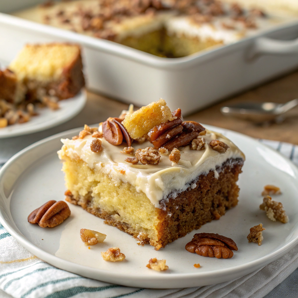 - For deeper flavor, lightly toast the pecans before adding them to the top of the cake.