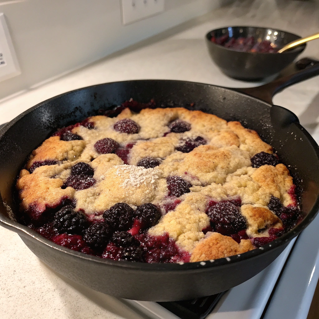 This iron skillet blackberry cobbler is simple, old-fashioned dessert comfort at its best. Sweet, juicy blackberries sink into a soft, golden, cake-like batter that bakes right in a cast iron skillet. The edges get beautifully crisp while the center stays tender and full of berry juices. It’s quick enough for a weeknight but special enough to share after Sunday dinner with family or friends. Serve it warm with a scoop of vanilla ice cream or a dollop of whipped cream, and don’t be surprised if you find yourself eating leftovers cold with coffee the next morning.