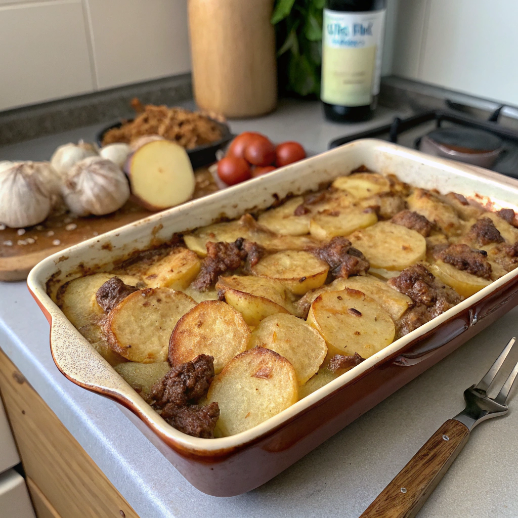 This meat and potato casserole is classic, cozy comfort food straight from grandma’s kitchen. Thinly sliced potatoes are layered with seasoned ground beef, onions, and a rich, creamy sauce, then topped with melted cheese. It’s kid-friendly, filling, and always a hit with adults too. Everything bakes together in one pan, making it perfect for busy weeknights when you want something hearty without a lot of fuss. Pair it with a simple salad or steamed veggies and you’ve got a full, satisfying family dinner.