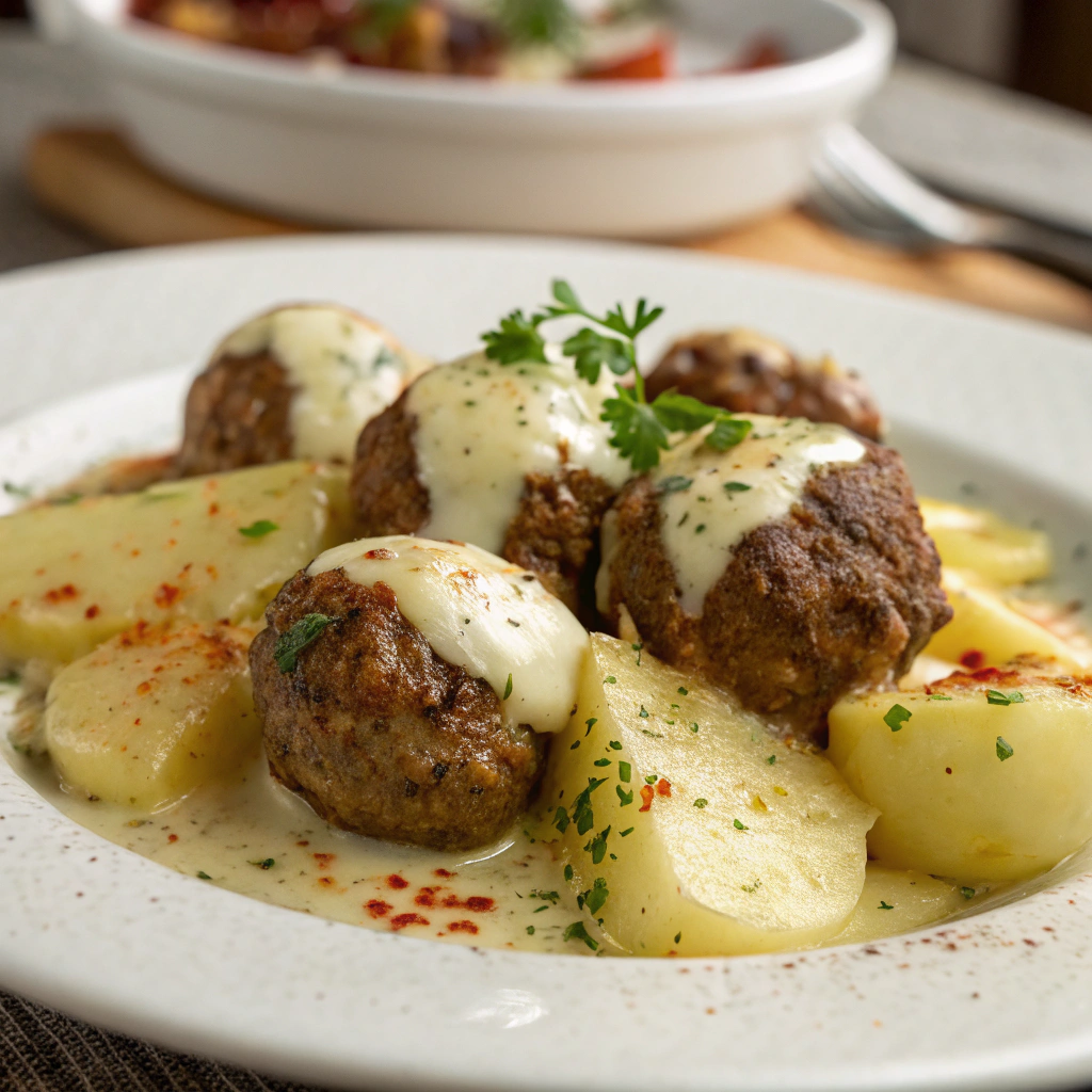 This Meatballs with Potatoes and Cheese bake is a comforting, family-friendly dish that layers tender potatoes, savory beef meatballs, and a creamy homemade béchamel. It’s hearty, cozy, and easy enough for weeknights while still feeling special. The bubbling mozzarella on top adds irresistible richness, and the mild spices keep it kid-approved. Serve it as a complete one-dish meal—no sides required unless you want a simple salad for freshness.