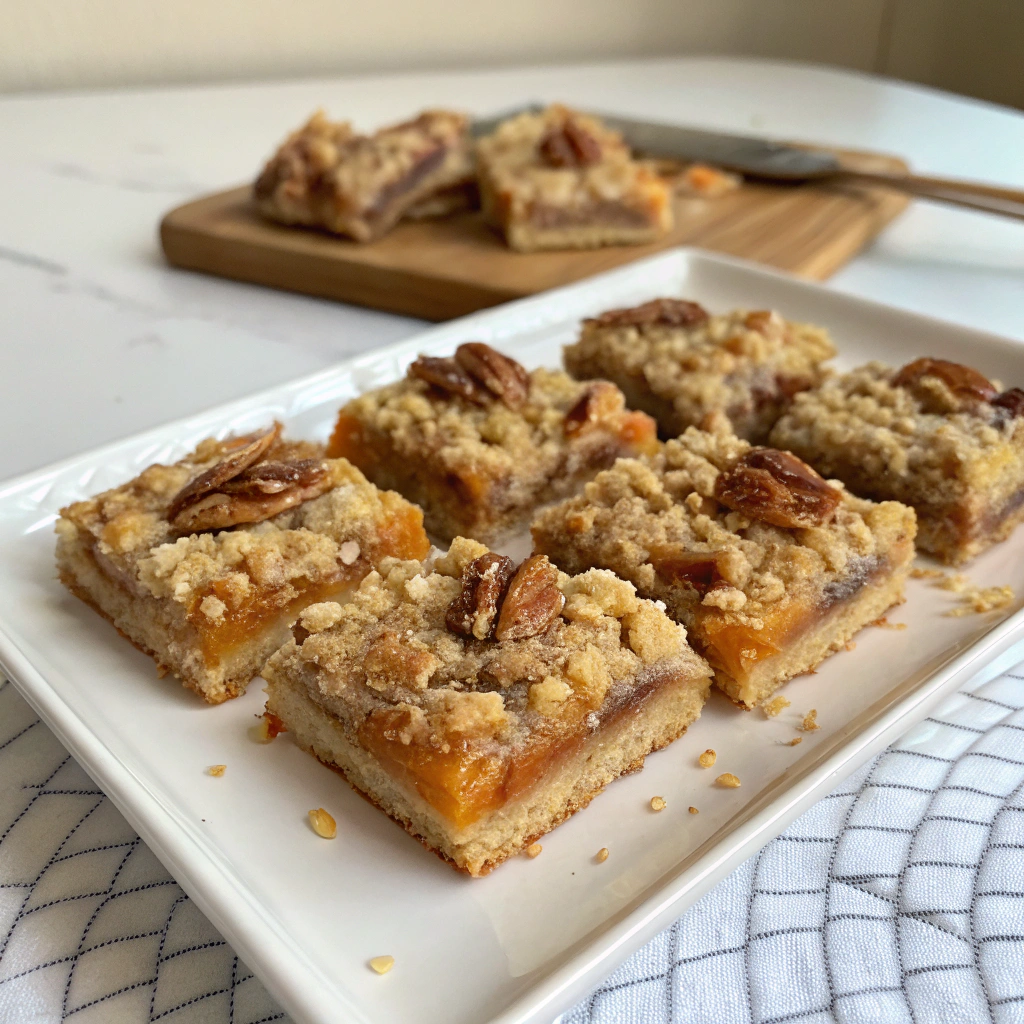 These apricot pecan crumble bars are a fruity, nutty twist on a classic dessert bar. A buttery coconut-oil shortbread crust gets topped with juicy, lemony apricots and finished with a crunchy pecan-oat streusel. They slice up like a cookie bar but taste a bit like a rustic fruit crisp, so they’re perfect for desserts, picnics, or a sweet snack with coffee or tea. They’re naturally dairy-free and feel a little lighter than traditional pecan pie bars, but still cozy and satisfying. Serve them plain, or warm them slightly and add a scoop of ice cream for an extra treat.